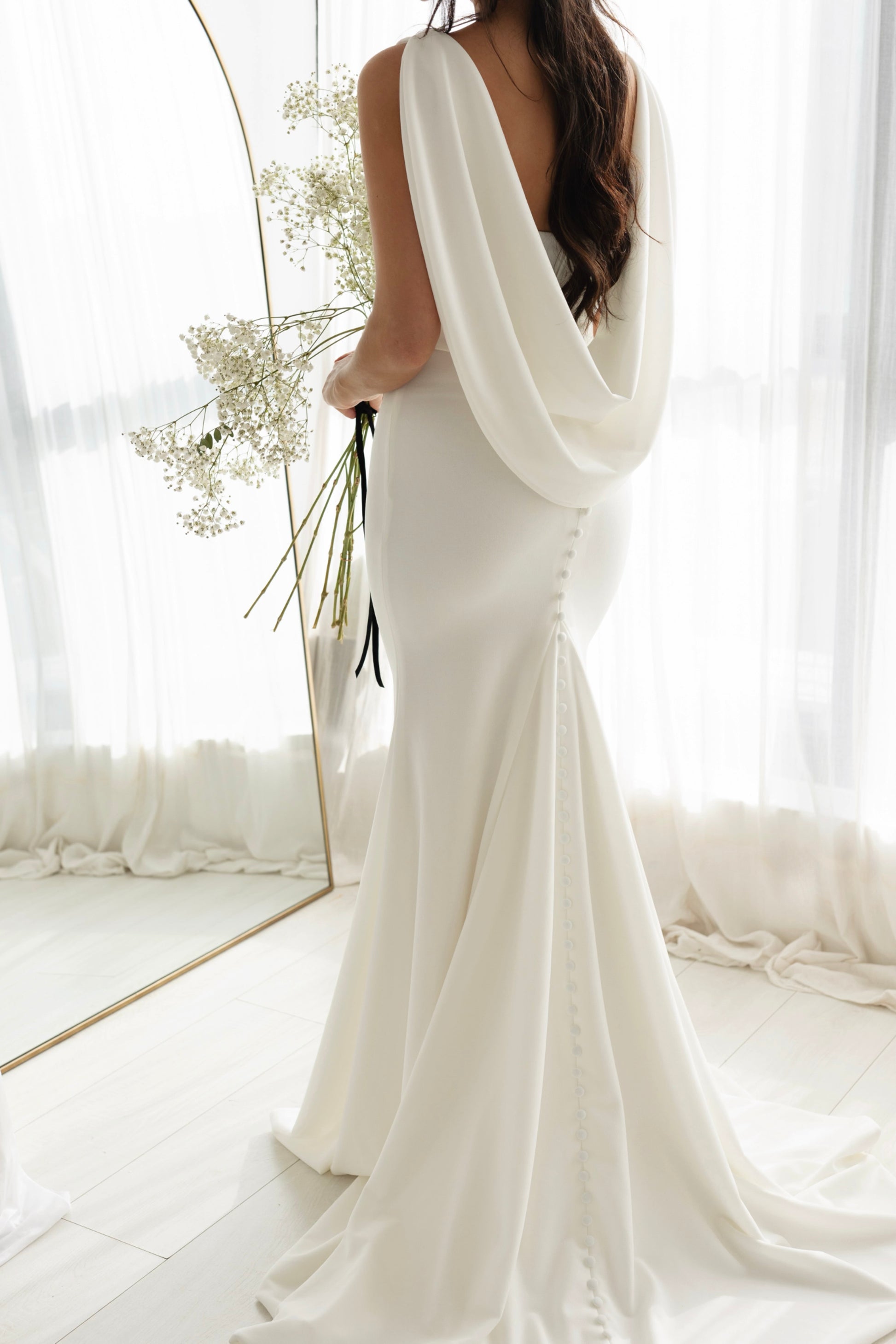 Carefully crafted using our signature bridal fabric. This fabric has the perfect weight to hold and smooth the body. Elegant plunging neckline with illusional flesh mesh and a waist cinching belt gives you a silhouette of dreams. The skirt drapes down into a mermaid finish with an extra long bridal godet and train. Precisely hand sewn bridal buttons run down your back all the way through to the end of the train. The star of the show is our extra large cowl back, adding lots of drama.
