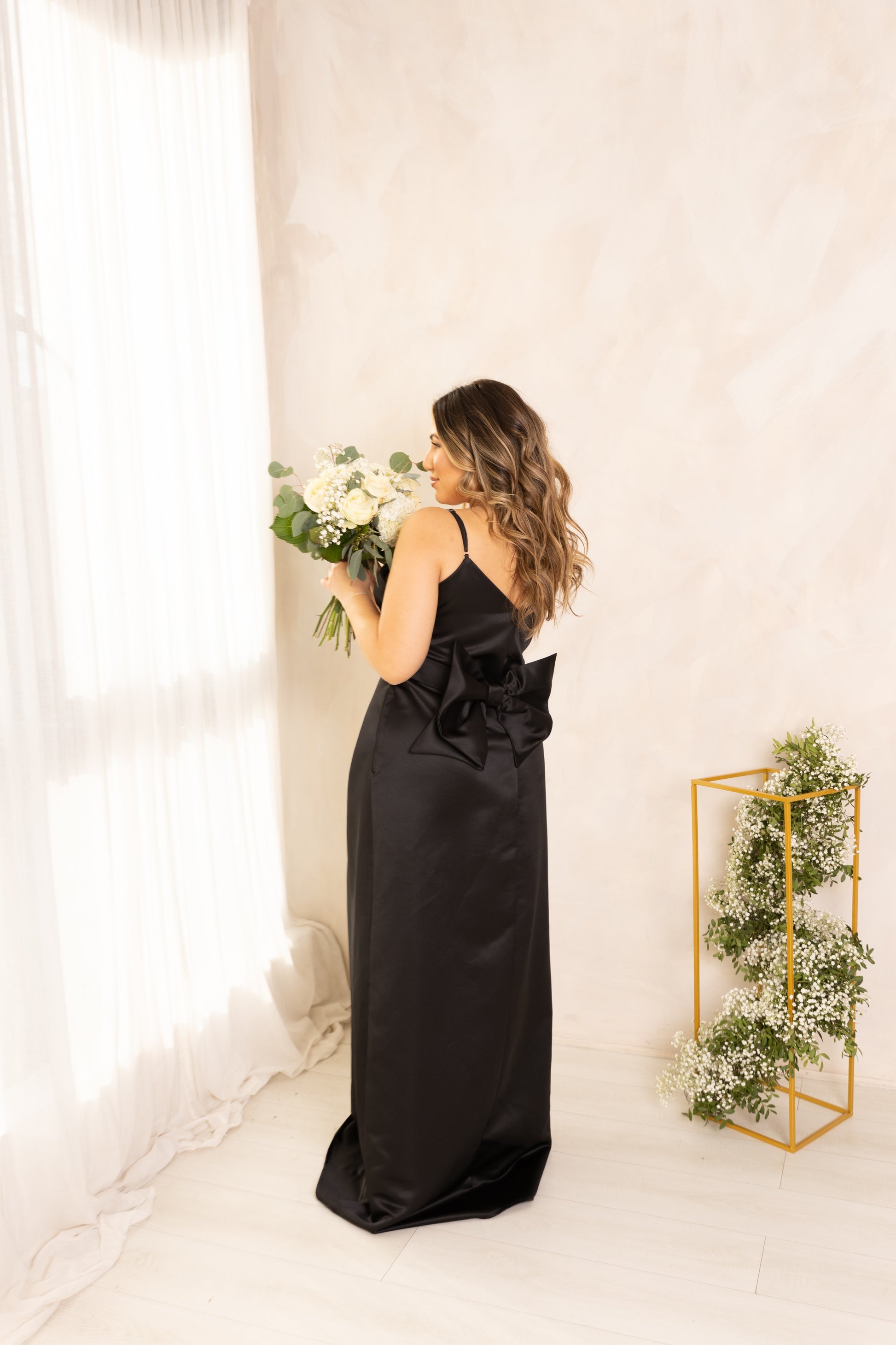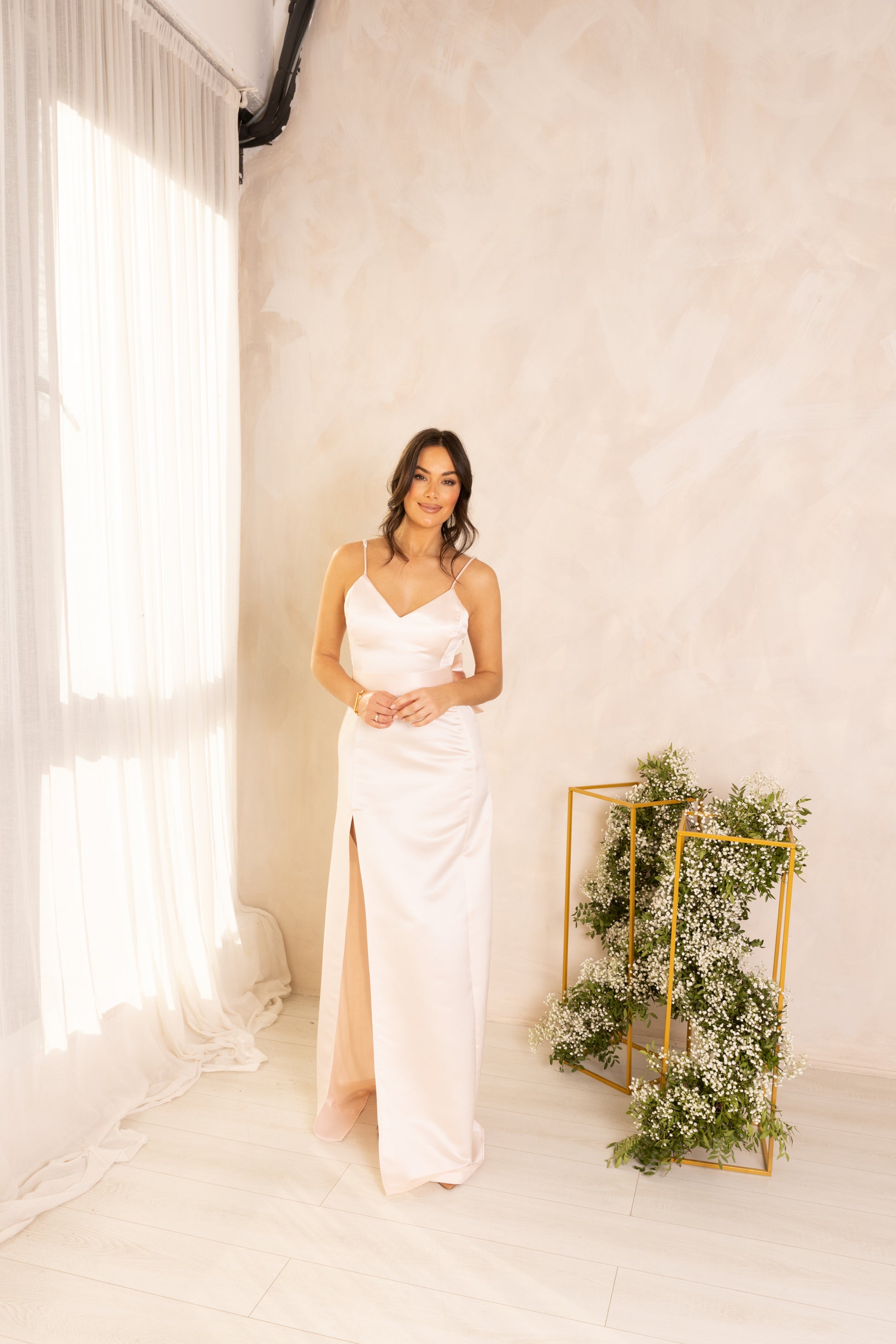 Inspired with romance in mind. The Orilla is a stunning satin based structured slip dress style. It’s crafted using the most luxurious bridal satin, in a selection of unique modern colour ways. Featuring a symmetrical neck and back line creating a gorgeous silhouette, structured panelling from top to bottom, flowing down into a thigh split.