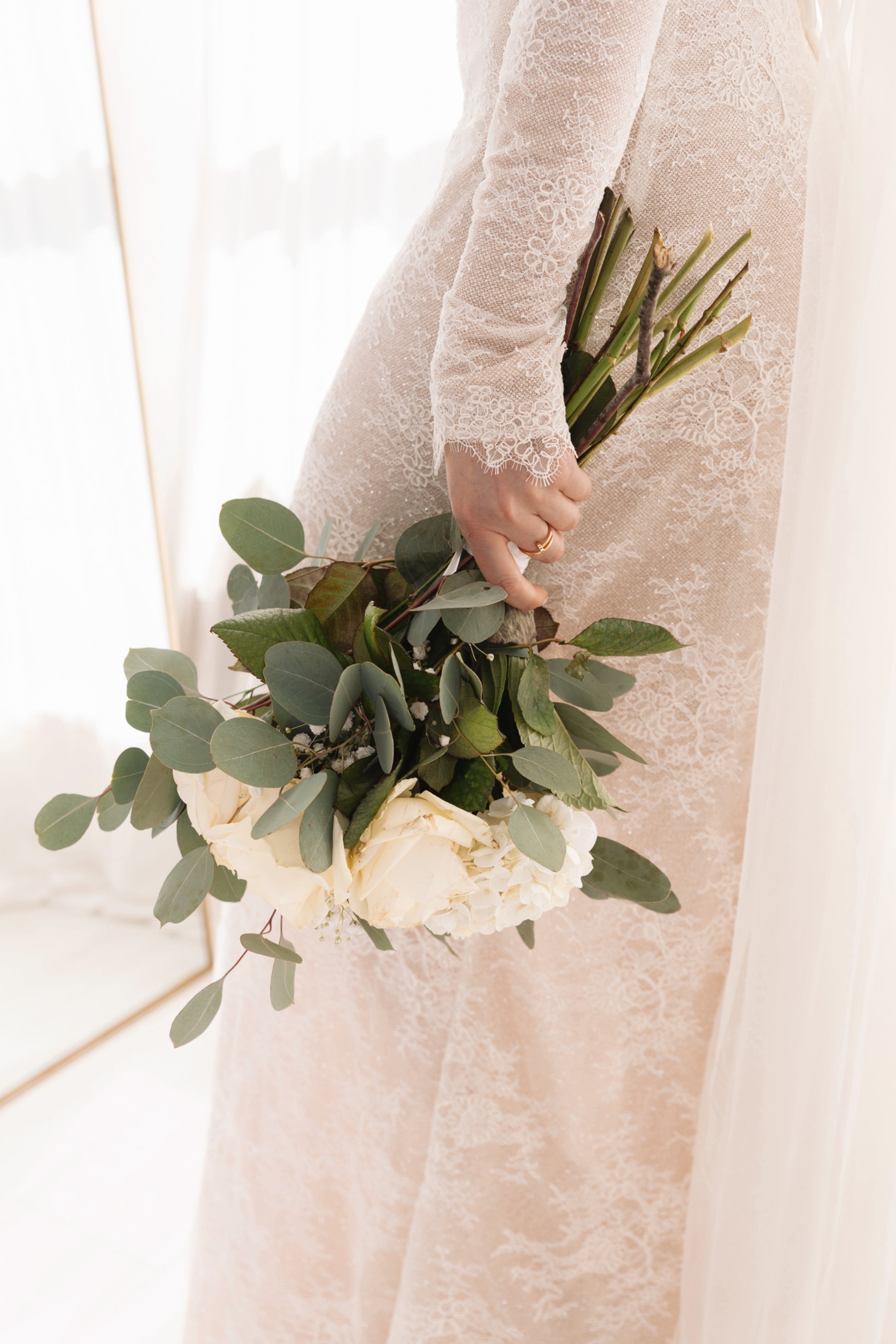 Carefully crafted using multiple layers of whimsical bridal fabric. These fabrics work in harmony, adding glitter, lace & illusional tulles for perfection. Paris features an elegant boned and cupped neckline, boned corset, with a cinched waist draping down into a mermaid silhouette with an extra long bridal godet and train. Finishing with a stunning lace up satin corseted back, delicate lace arms with scalloped detail sweeping across the hands and a special addition necklace lace choker, that can be worn and removed as desired.