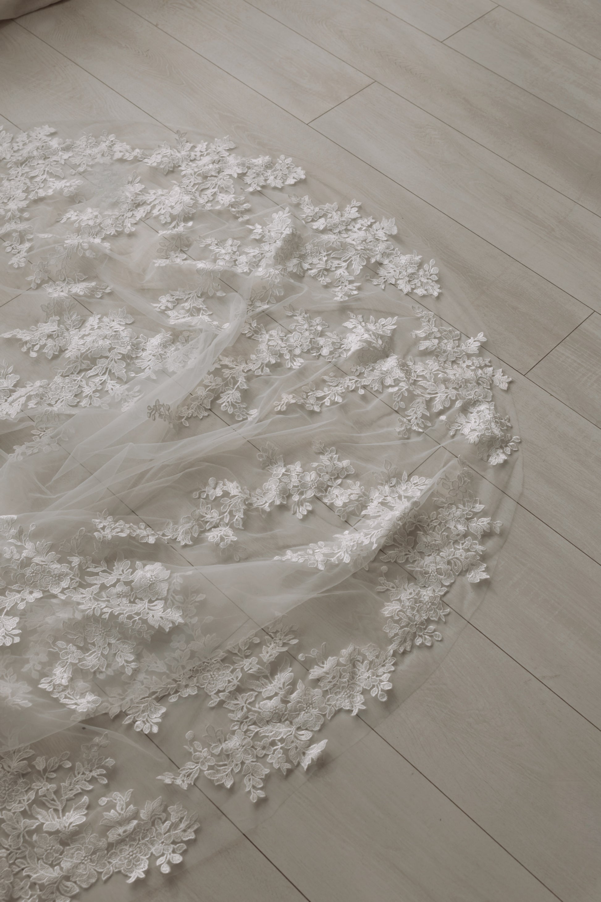 Romance Cathedral Veil is a timeless classic. Bridal lace softly sits along the edging of the veil, with a blusher cut in for true tradition. This style is in keeping for the traditional but modern bride.